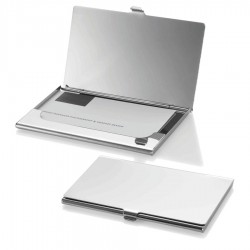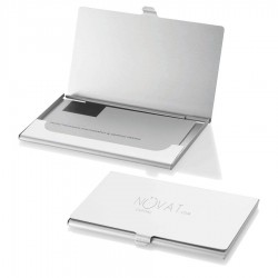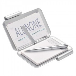 Aluminium business card holder with ballpoint pen. Once you open the product, one side has a notepad with 30 pcs of blank paper and on the other side there is space for ten business cards.