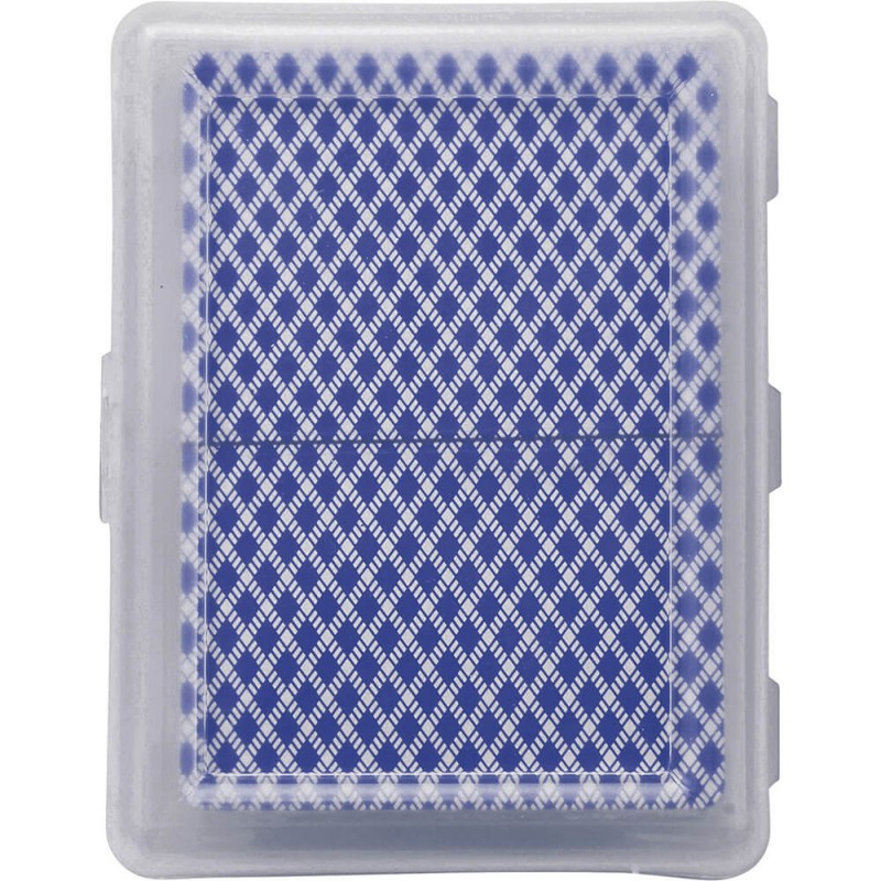 Set of playing cards with a patterned back in a clear acrylic case. Branding is on the acrylic case.