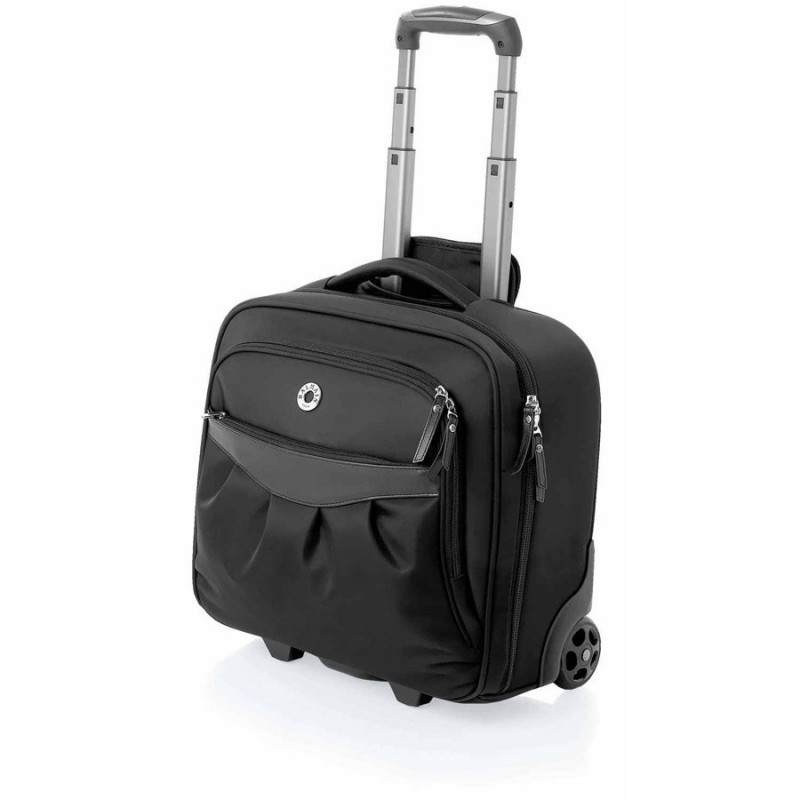 Trolley Bag with padded laptop compartment & multiple pockets and retractable handle. Features trolley bag with padded laptop compartment, multiple internal and external pockets. Trolley Bag made in sturdy 840D Nylon, Black PVC base, Retractable handle & top carry handle, Each piece packed in black nylon drawstring dust cover bag