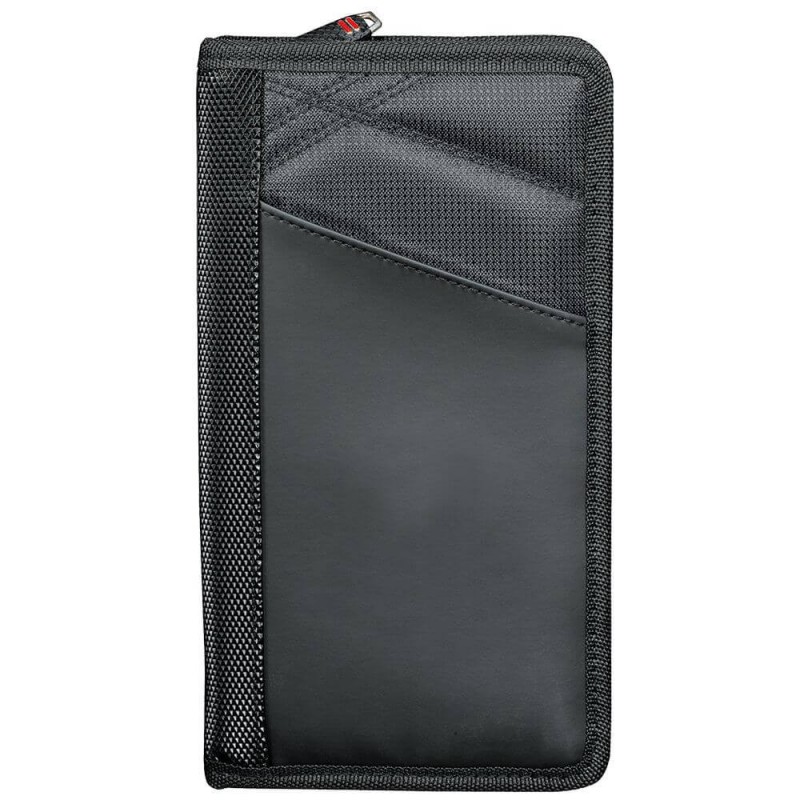 This sophisticated designed travel wallet is the ideal travel companion with multiple pockets, the wallet is able to store credit cards, papers, change and Features several other functional pockets. Microfibre.