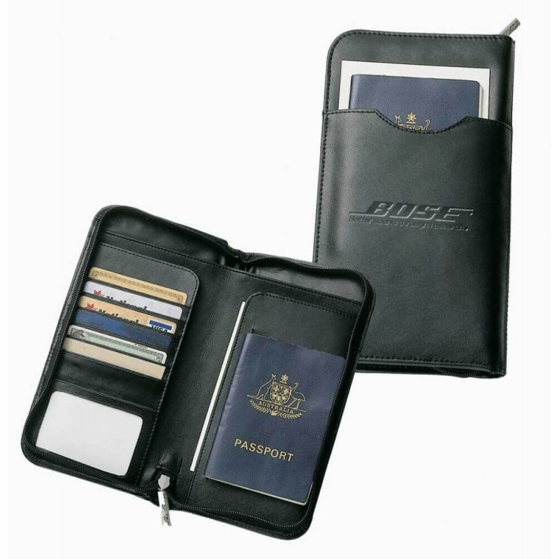 This soft grain finish zippered travel wallet makes the ideal travel companion. Features include a passport pocket, multiple card pockets, ticket flap, security compartment with zip and pen loop. Your logo can be printed onto the wallet or engraved on the brushed chrome accent plate. Pen additional.