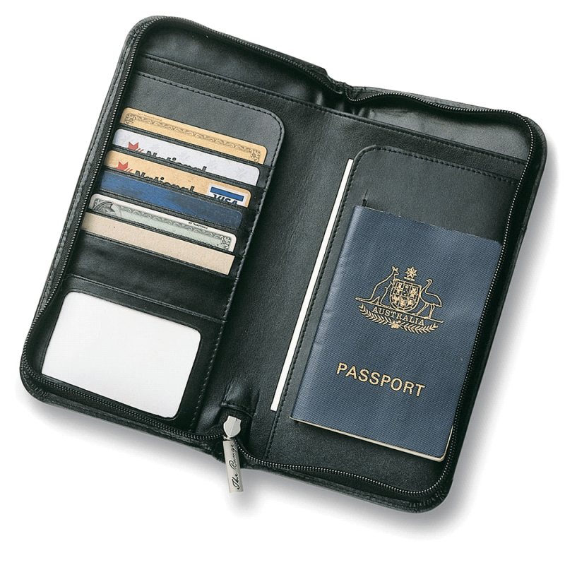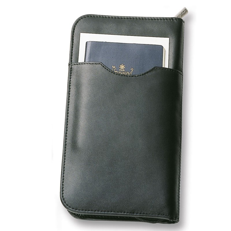 Combines quality leather construction with practical design. Features include passport pocket, credit card pockets, ticket flap, security zip pocket and pen loop.