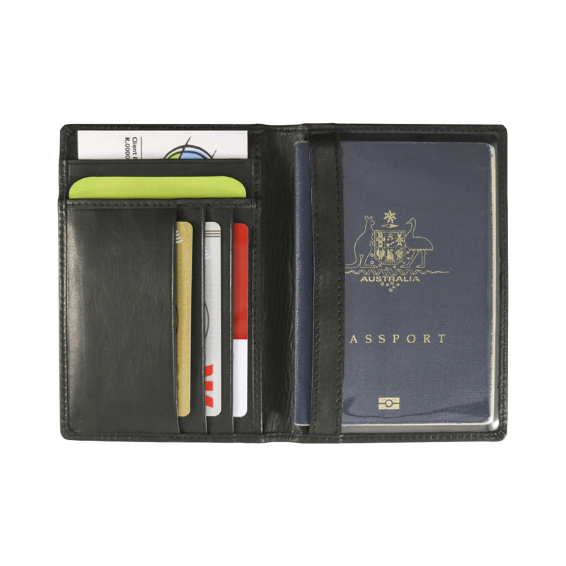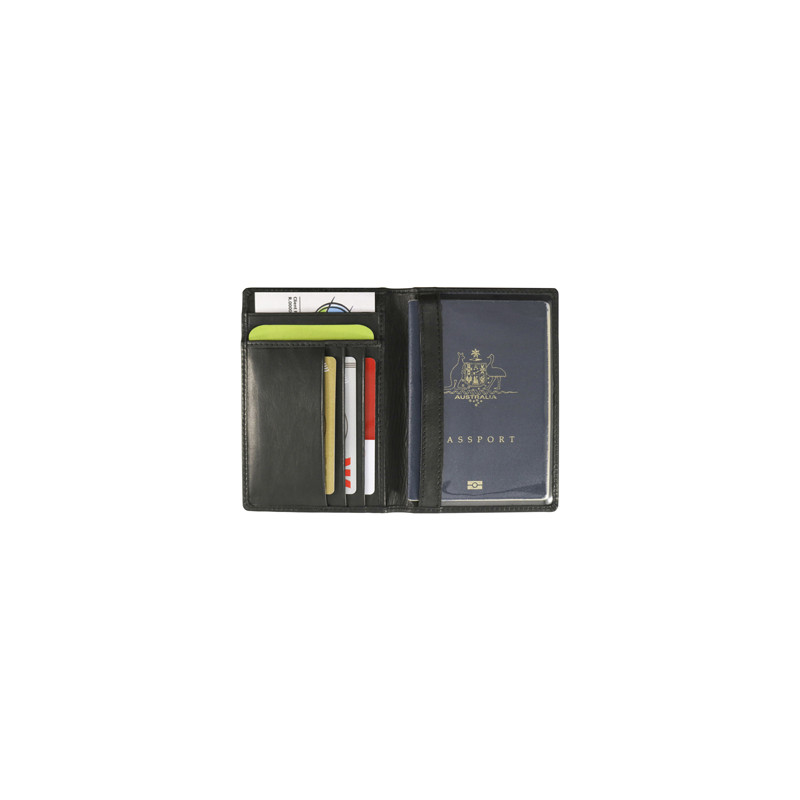 Combines quality leather construction with practical design. Features include passport pocket, credit card pockets, ticket flap, security zip pocket and pen loop.