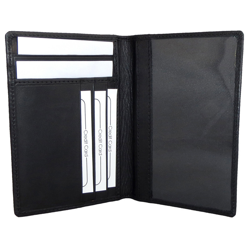 Very stylish travel accessory. Open main compartment for storing all travel documents. Multiple pockets for passport, tickets, itinerary, credit cards and business cards. Black leather.