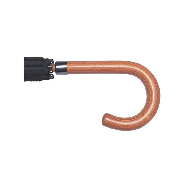 A classically-styled and elegant umbrella with a wooden shaft. A hook handle completes the vintage look.