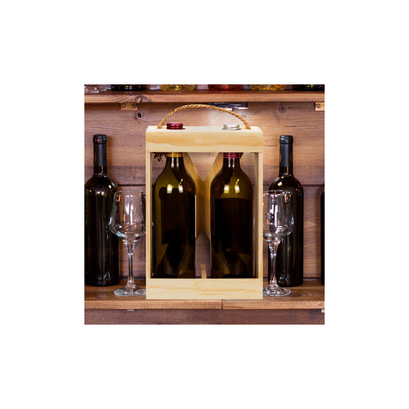 Elegant wine gift box made from natural pine wood with a sliding lid that offers a large branding area. The box is designed to hold two standard wine bottles and has built-in dividers with shredded paper filling. A woven rope handle makes it easy and comfortable to carry.