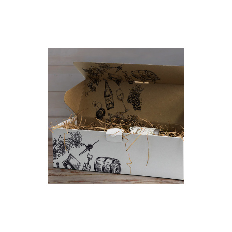 Elegant wine gift box made from natural pine wood with a sliding lid. The box is designed to hold one standard wine bottle and has built-in dividers with shredded paper filling. A woven rope handle makes it easy and comfortable to carry.