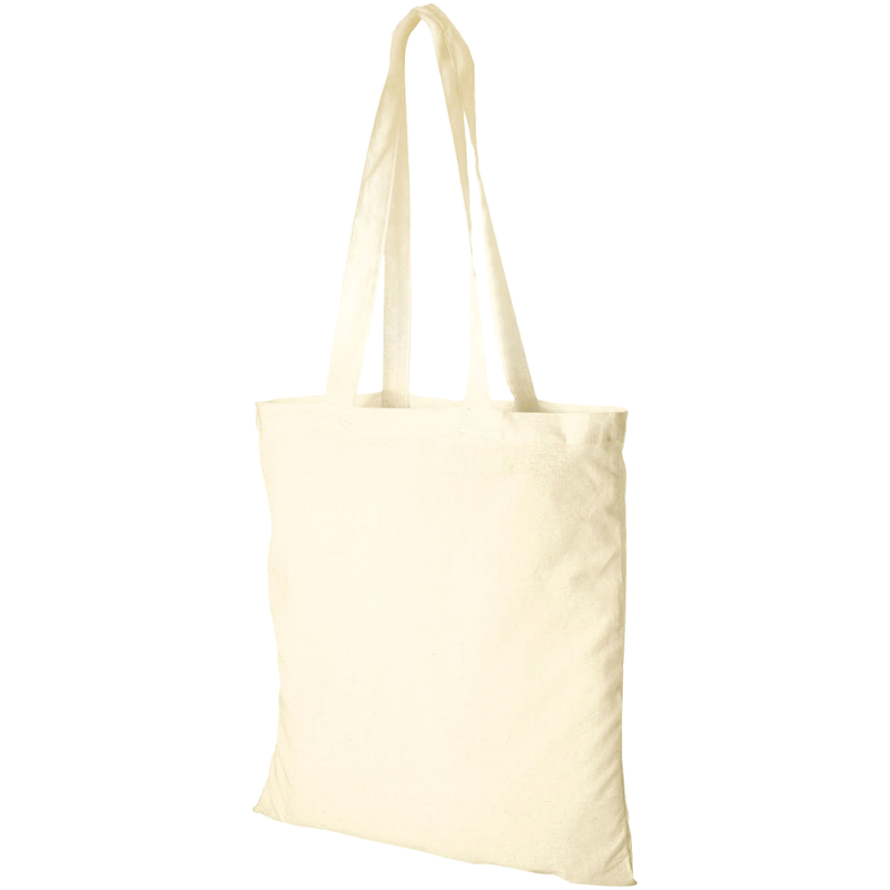 140gsm long handle Echo friendly cotton tote bag with no gusset, 100% natural, overlocked stitching, unbleached natural cotton material is a renewable and biodegradable resource. Can be carried by hand or over the shoulder. Ideal for any environmental events, a great promotional bag to reduce the use of plastic bags.