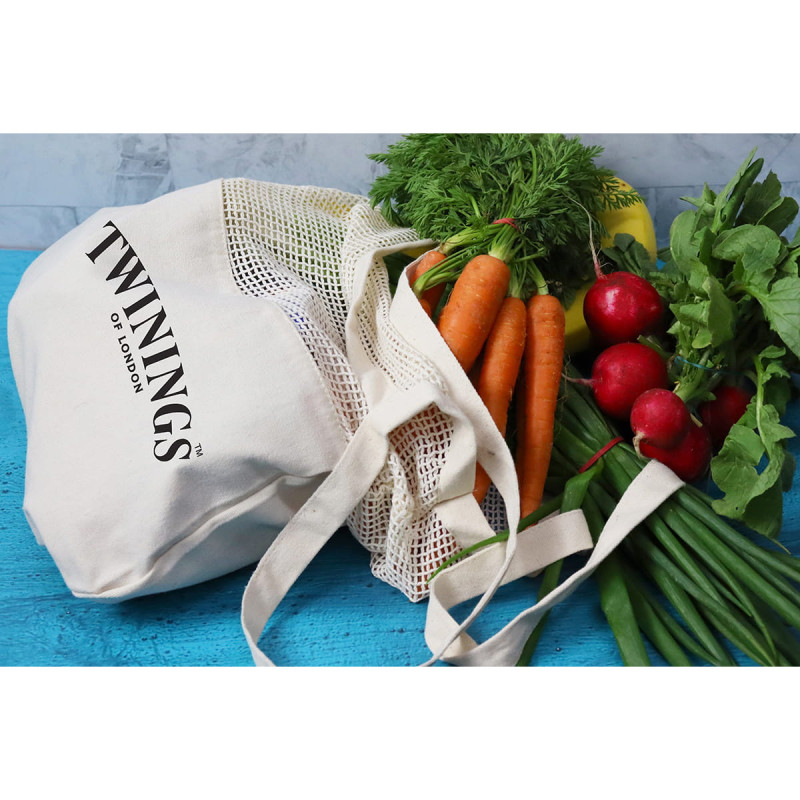 Compact reusable tote bag which is manufactured from 100gsm unbleached cotton mesh. It has a small cotton slip pocket which can be used for storing credit cards, keys etc. and the bag can also be folded to fit in it when not in use.