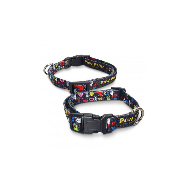 Custom cat collar made from polyester which can be branded with vibrant sublimation print. The collar features an adjustable buckle, a D-ring, a breakaway clip and a bell. The lead time for this product is 35 working days.