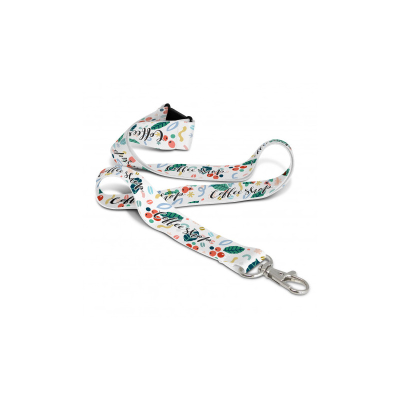 20mm wide polyester lanyard with a metal clip and a safety clip. It can be branded in one colour on one side.