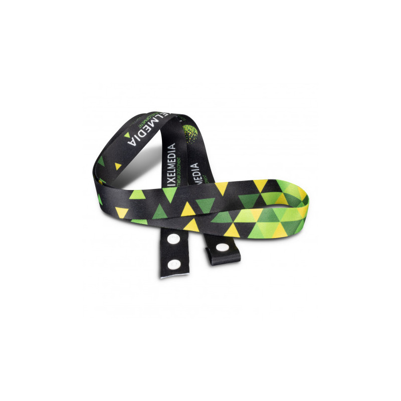 20mm wide ribbon lanyard with a metal ring, a clip and a breakaway safety clip. It can be printed in one colour on one side.