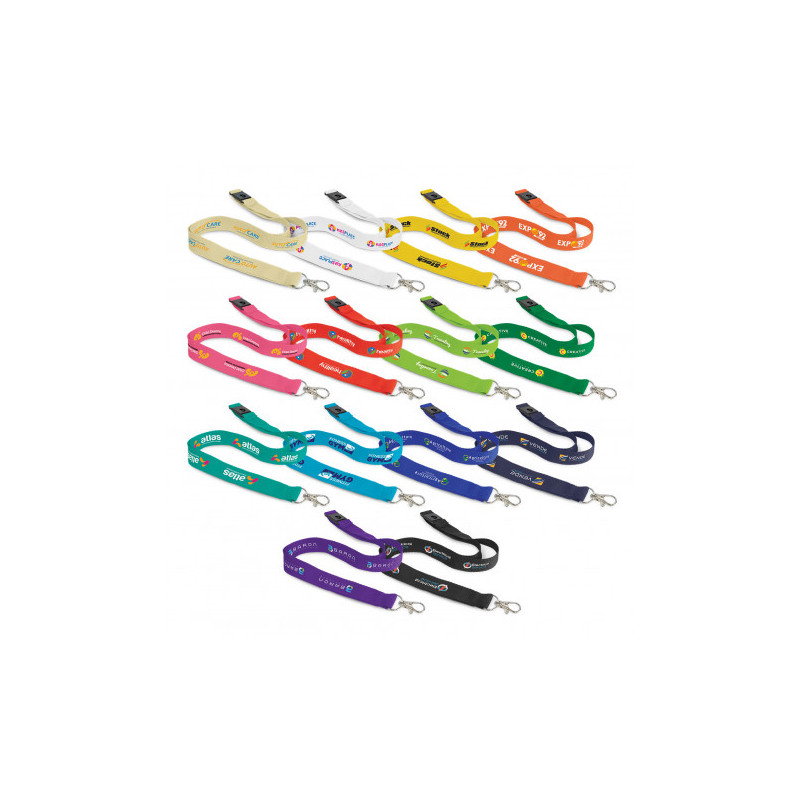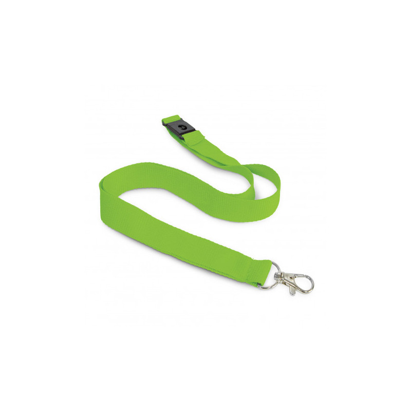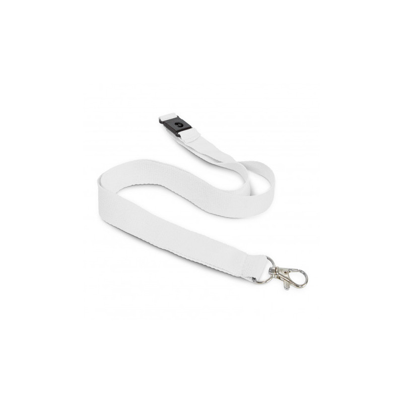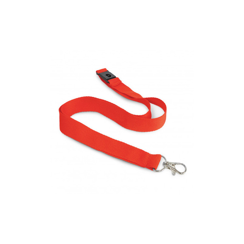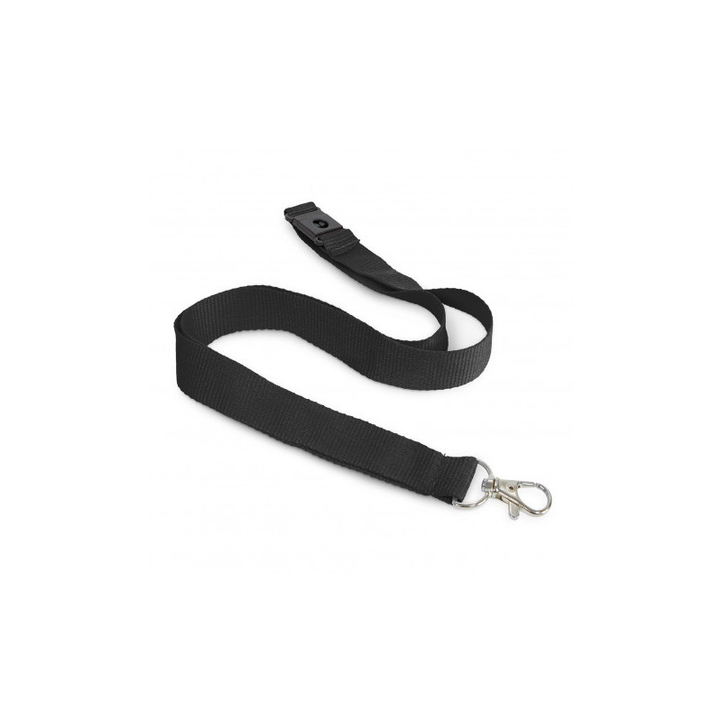 20mm wide ribbon lanyard with a metal ring, a clip and a breakaway safety clip. It can be printed in one colour on one side.