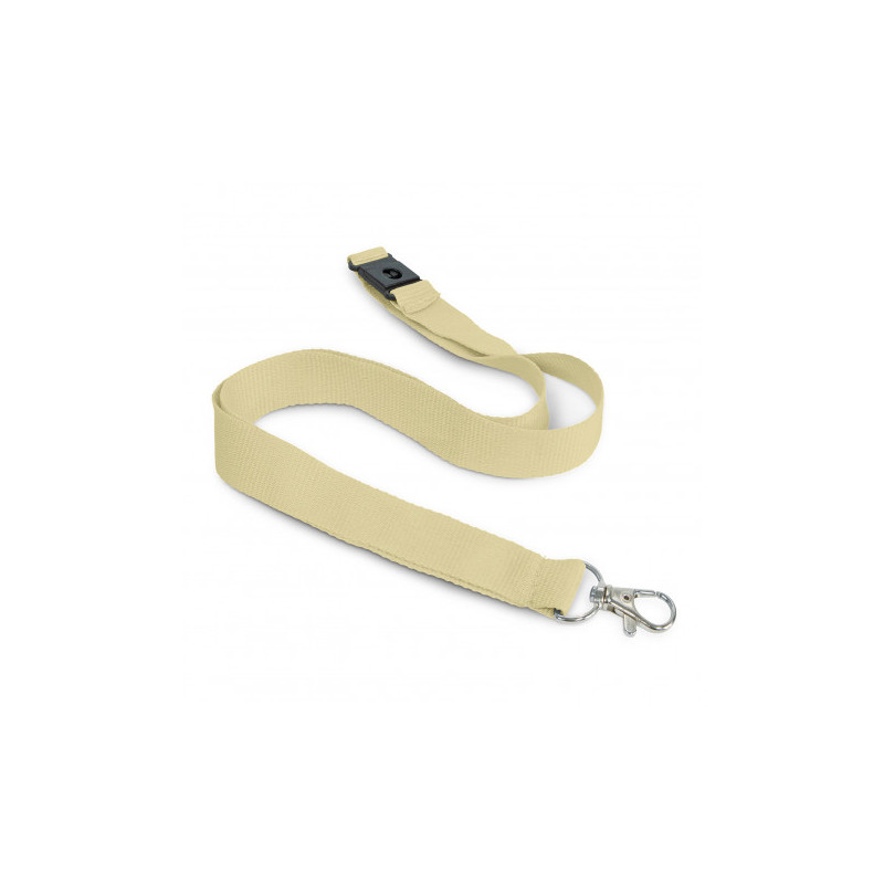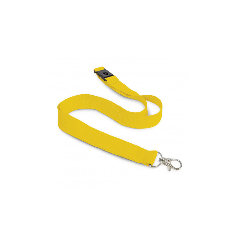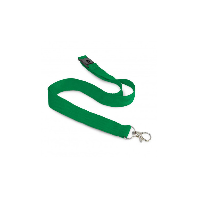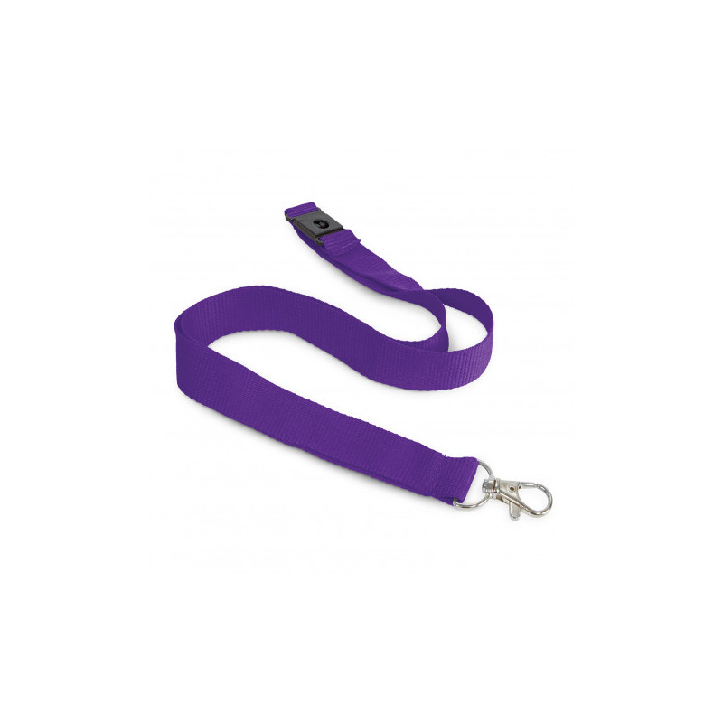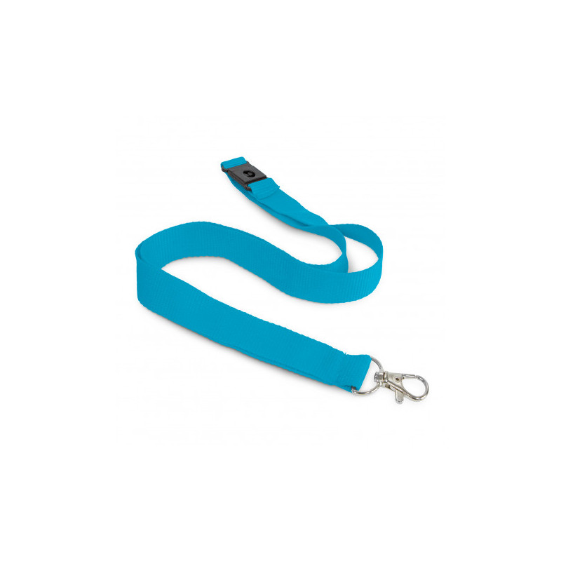 20mm wide polyester lanyard with a metal clip and a safety clip. It can be branded in one colour on one side.