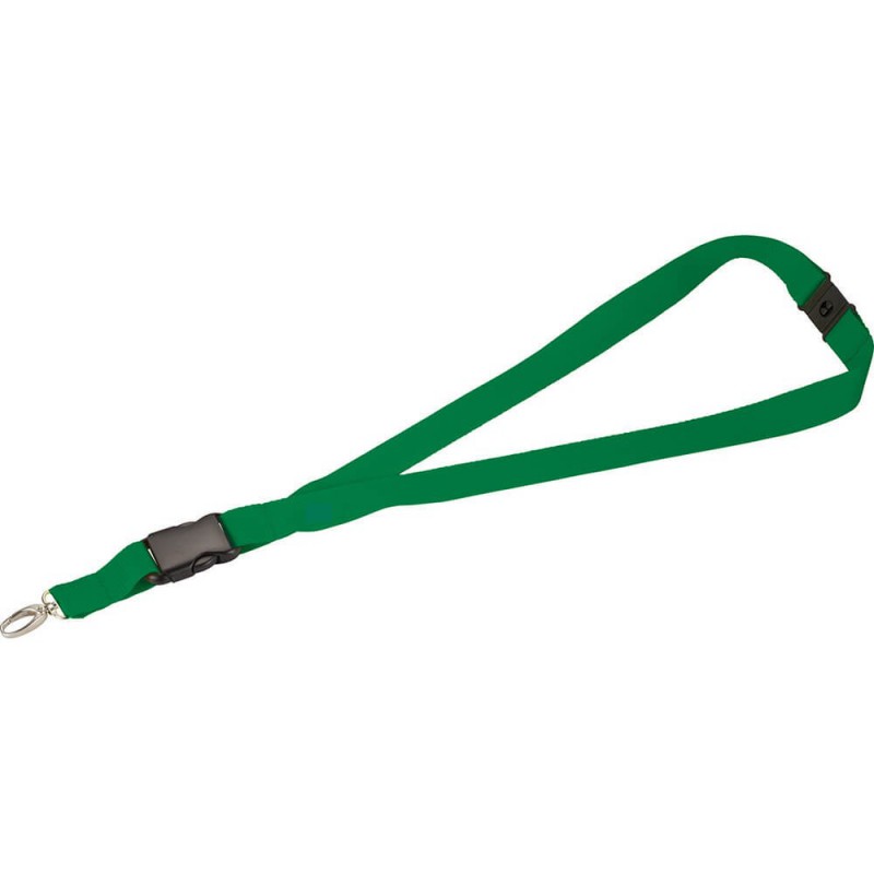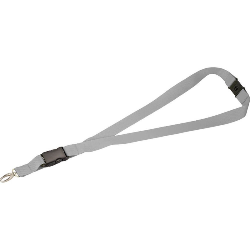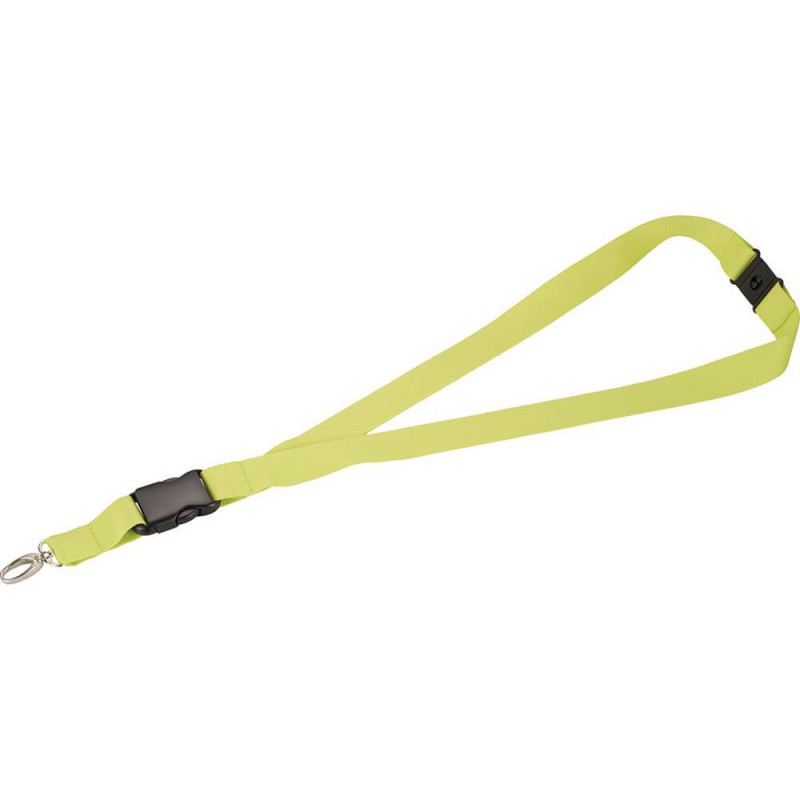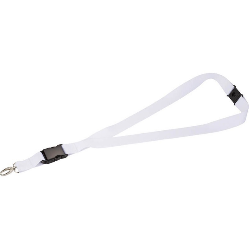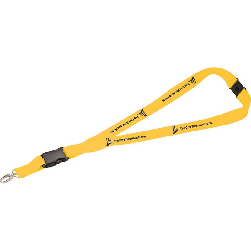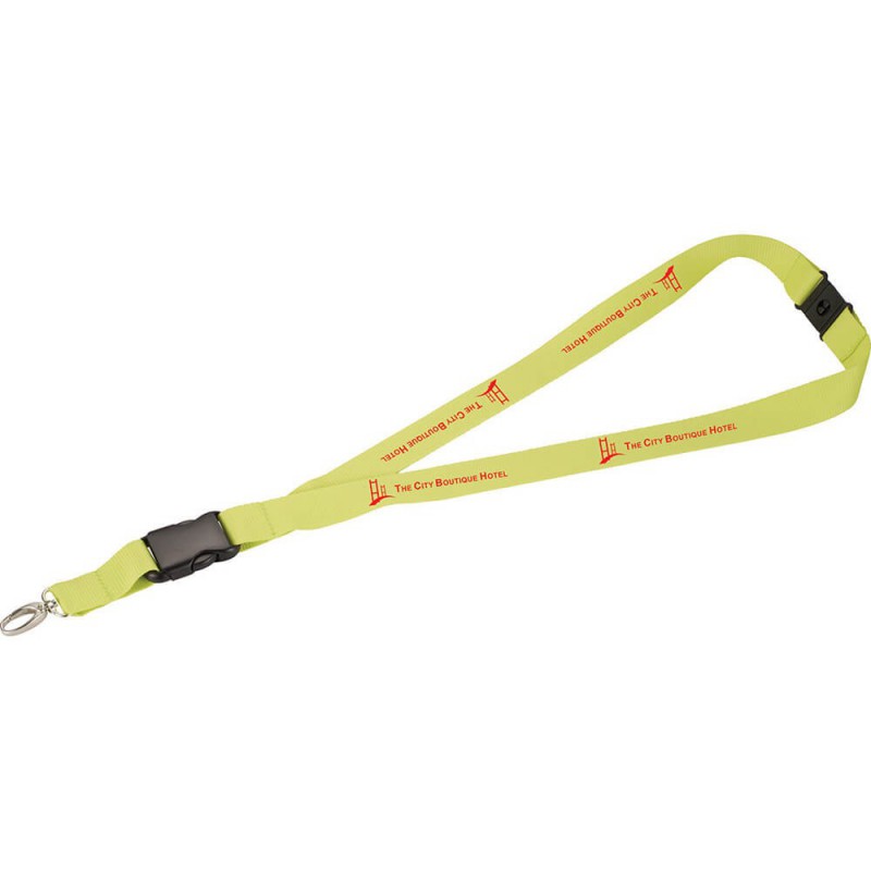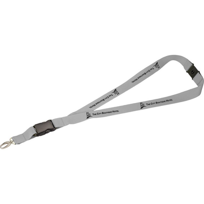 20mm wide ribbon lanyard with a metal ring, a clip and a breakaway safety clip. It can be printed in one colour on one side.