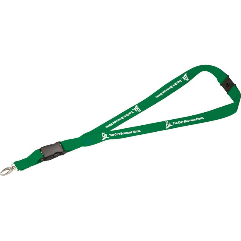 3/4-inch wide lanyard includes breakaway neck clip and swivel lobster clip. Second location setup & run charge waived if both sides decorated with same artwork. Clear PVC Badge Holders available at additional charge. Optional Badge holders not available for imprint.