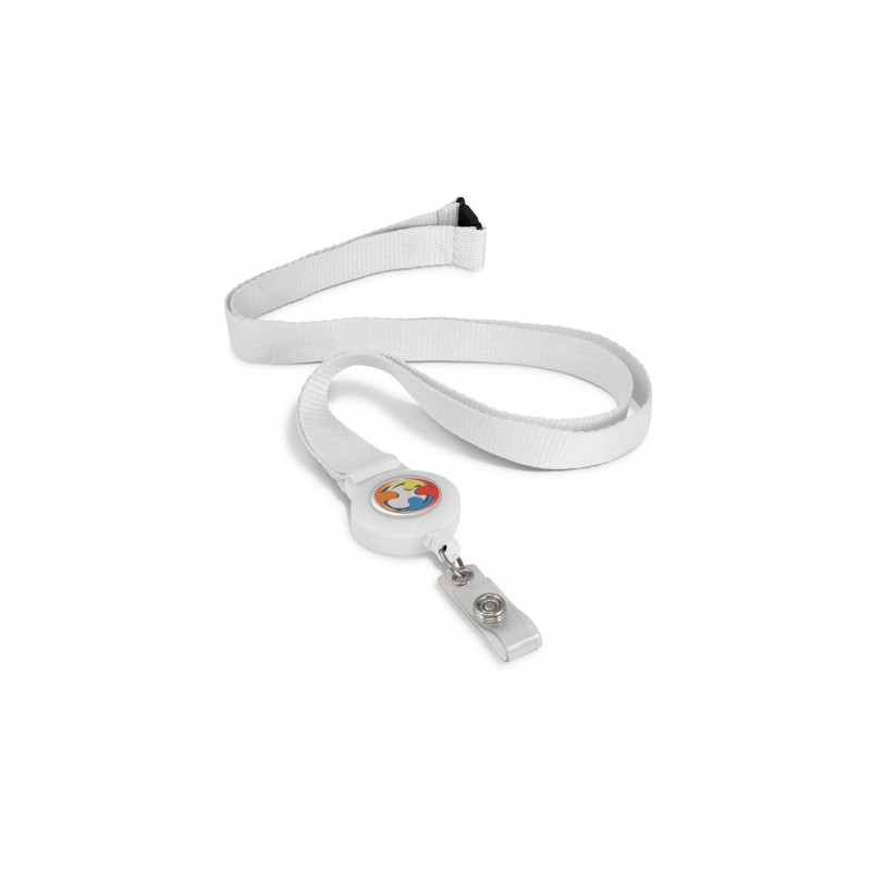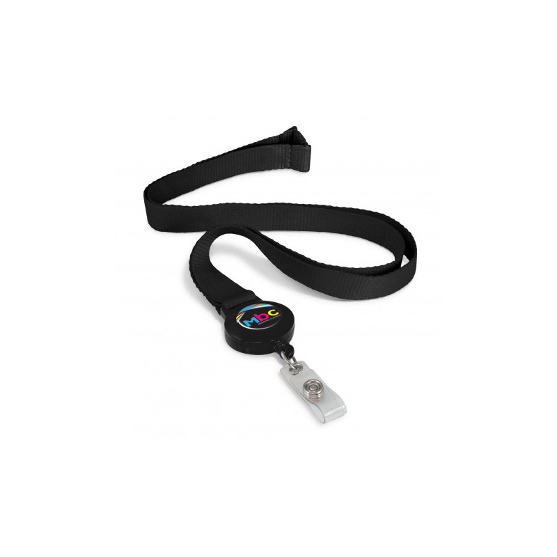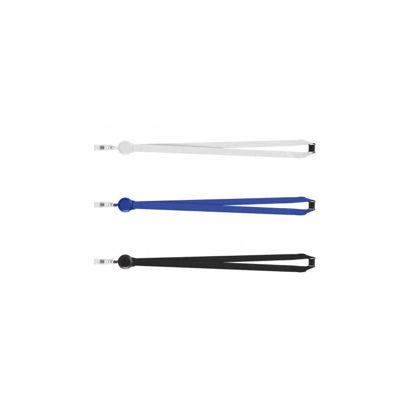 20mm wide ribbon lanyard with a metal ring, a clip and a breakaway safety clip. It can be printed in one colour on one side.