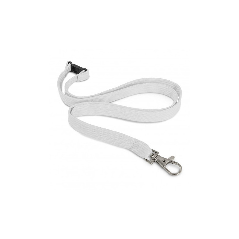 20mm wide ribbon lanyard with a metal ring, a clip and a breakaway safety clip. It can be printed in one colour on one side.