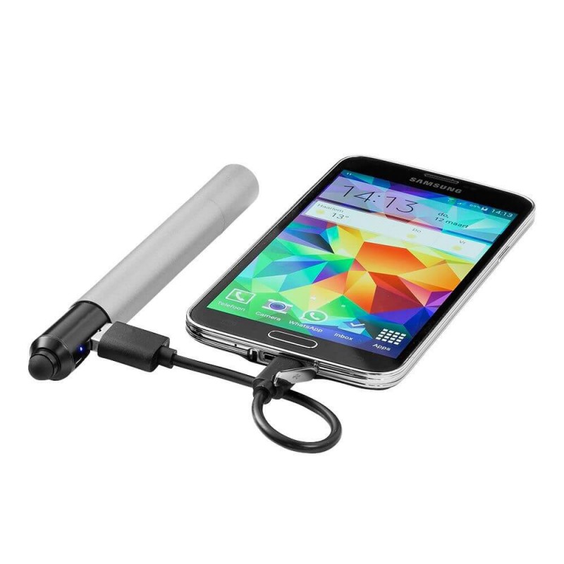 Rectangular shaped power bank with corded split ring from 2000 mAh Lithium-ion battery. Output - DC 5V / 1A (USB), Input - DC 5V / 750 mA (Micro USB). Built in IC chip prevents overcharging & short circuit. Charge time 2-3 hours, battery cycle life greater than 500 times. USB to micro USB cable included. It can be used to charge most of cell phones...