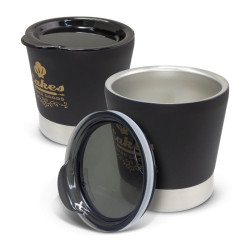 Low profile 260ml double wall, vacuum insulated stainless steel coffee cup which will fit under commercial coffee machines. Calibre is BPA-free with a transparent push on lid and will keep drinks hot or cold for hours. The black and white cups laser engrave to a shiny steel finish and the silver cups engrave to a natural etch. The cup is presented in a...