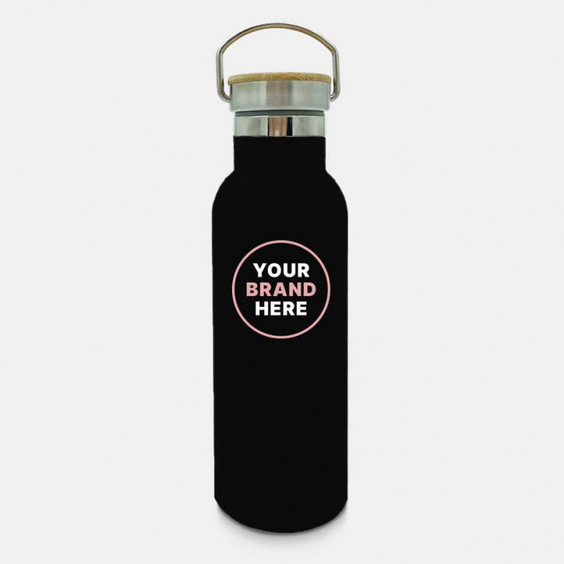 Sophisticated 600ml aluminium drink bottle with a timeless design and a smart painted finish. It is BPA-free, has a secure bamboo screw on lid and it can be presented in an optional black gift box. Bamboo is a natural material which produces unavoidable variances in the grain pattern, colour and branding. This product is not dishwasher safe and...