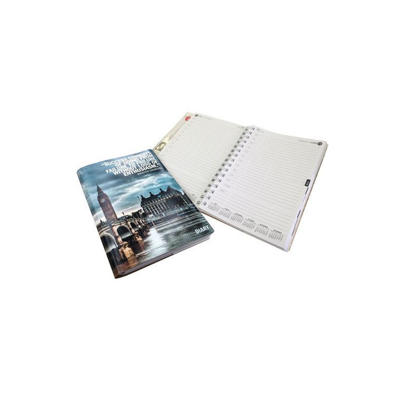 Australian MadeA5 Wiro bound diary. The board and the poly are bound to the diary (front & back). 310gsm board cover is printed 4 Colour Process and can be fully personalised with the recipients logo, photo, name, etc. Unprinted polypropylene is then used to protect the diary. As an additional feature these diaries can be fully personalised with the...