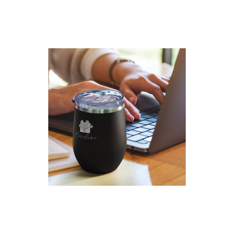 350ml double walled stainless steel vacuum cup with secure screw lid & flip up tab with silicone seal. Drinks will remain hot/cold for up to 6 hours. Slim design and suitable for car cup holders. BPA free. For logo longevity hand washing is recommended. Not suitable for carbonated liquids or freezing. Eco Credentials: Reusable, Sustainable, Printed...