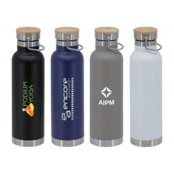 Robust 1L stainless steel, vacuum insulated drink bottle with a tough powder coated finish. The bottle features a stainless steel screw on lid with a convenient carry handle and the option of a bamboo panel. The bottle is presented in a black gift box.
