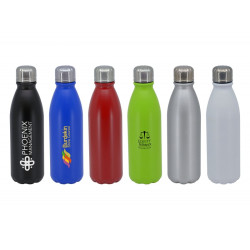 This quality 750ml drink bottle is made from solid yet light-weight aluminium. Its on-trend shape is complemented by a brushed stainless steel lid, designed for those on the go. Promo bottle features an upmarket matt finish available in black, white, red, blue, green or silver. For use with cold liquids only.