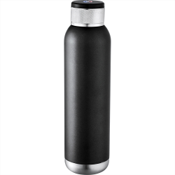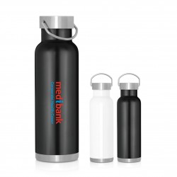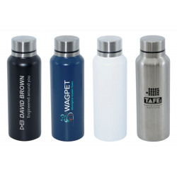 Deluxe 600ml stainless steel drink bottle that is vacuum insulated with a sleek design and a smart painted finish. It is BPA-free and features a secure stainless-steel screw-on lid which features a white polypropylene trim. It can be presented in a kraft gift box. The bottle is not dishwasher safe, and handwashing is recommended.