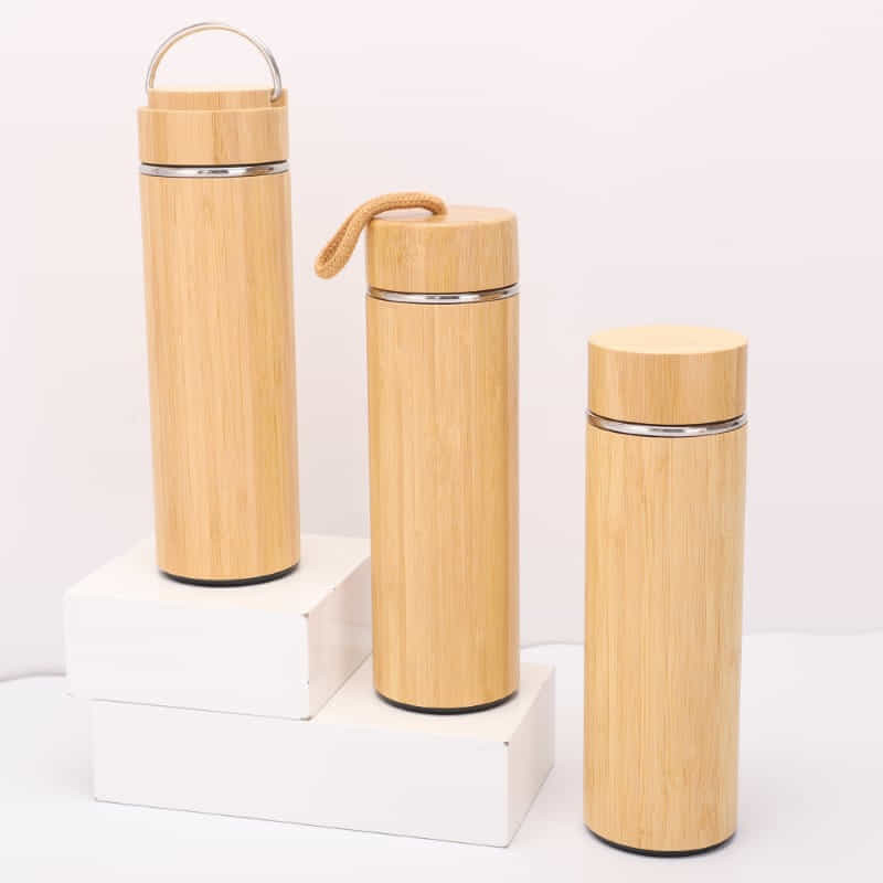 Elegant 500ml stainless steel vacuum bottle with a bamboo lid and base. It has a satin finish and comes in a kraft gift box.