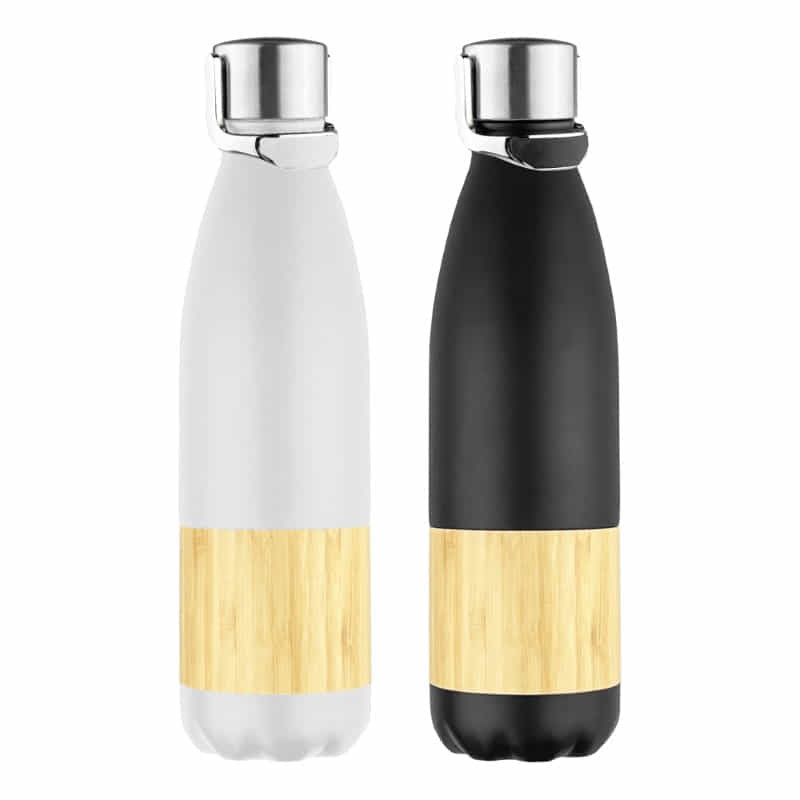 Robust 1L stainless steel, vacuum insulated drink bottle with a tough powder coated finish. The bottle features a stainless steel screw on lid with a convenient carry handle and the option of a bamboo panel. The bottle is presented in a black gift box.