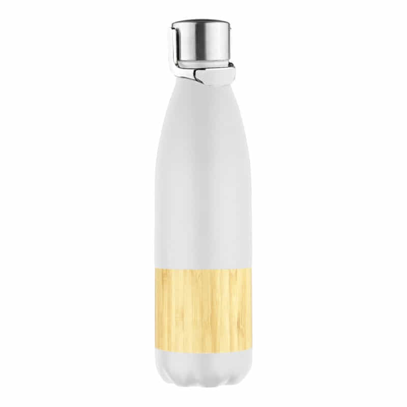 Deluxe 600ml stainless steel drink bottle that is vacuum insulated with a sleek design and a smart painted finish. It is BPA-free and features a secure stainless-steel screw-on lid which features a white polypropylene trim. It can be presented in a kraft gift box. The bottle is not dishwasher safe, and handwashing is recommended.