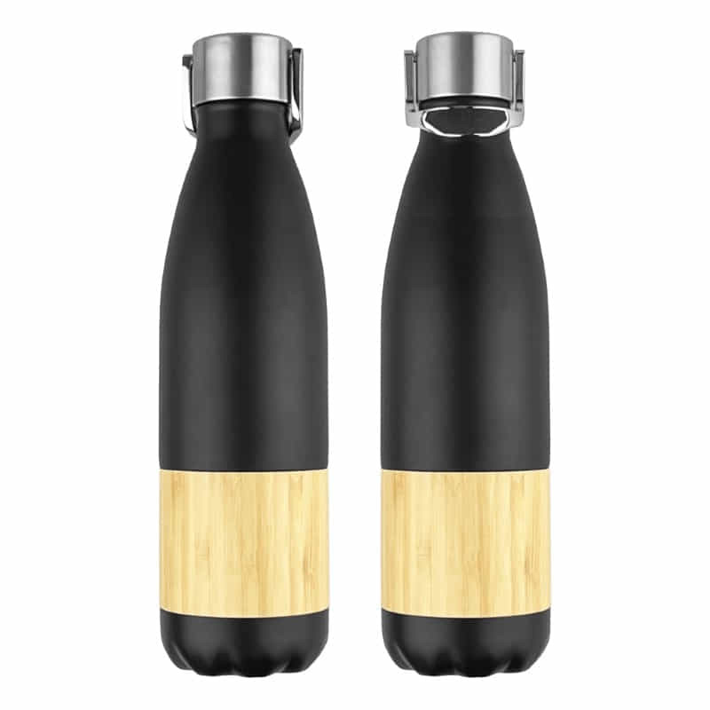 Elegant stainless steel vacuum bottle with a capacity of 480ml. Medina has a matte black body and a wood grained water transfer lid.