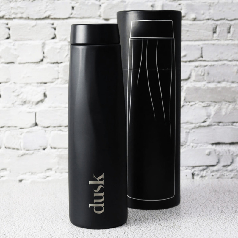 Fashion-inspired stainless steel 750ml bottle with a gloss finish. It has a screw-on lid with a black ribbon handle. Tornado is BPA-free. The bottle laser engraves to a shiny stainless-steel finish. This product is not dishwasher safe, and handwashing is recommended.