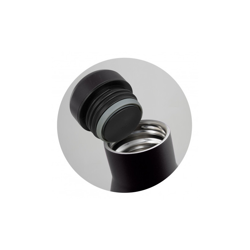 Elegant stainless steel vacuum bottle with a capacity of 480ml. Medina has a matte black body and a wood grained water transfer lid.