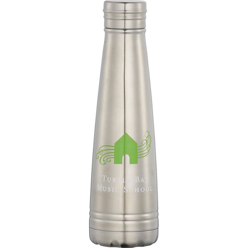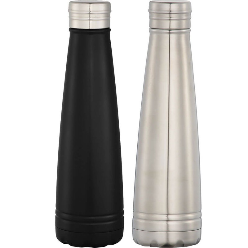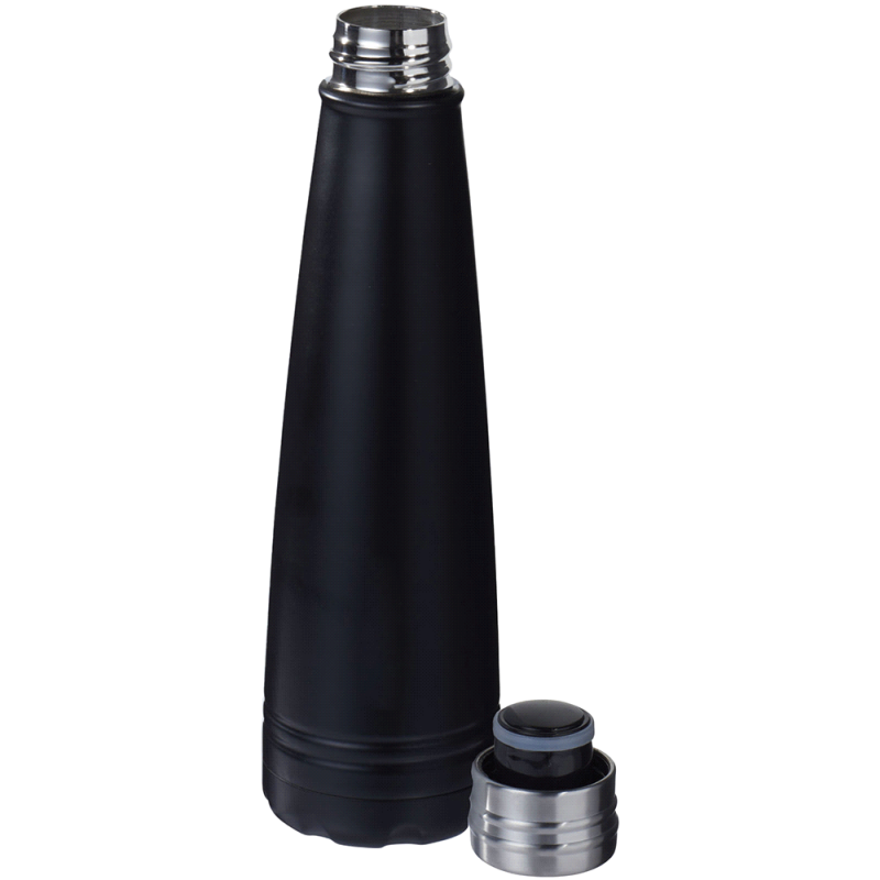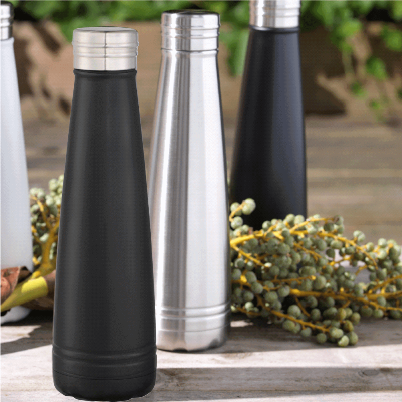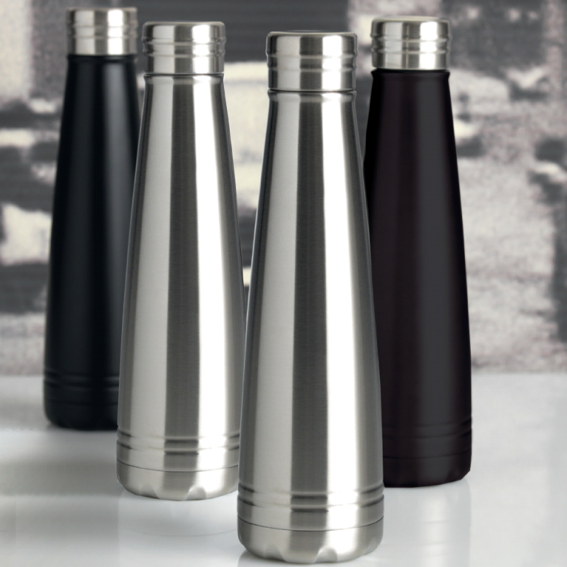 Deluxe 600ml stainless steel drink bottle that is vacuum insulated with a sleek design and a smart painted finish. It is BPA-free and features a secure stainless-steel screw-on lid which features a white polypropylene trim. It can be presented in a kraft gift box. The bottle is not dishwasher safe, and handwashing is recommended.