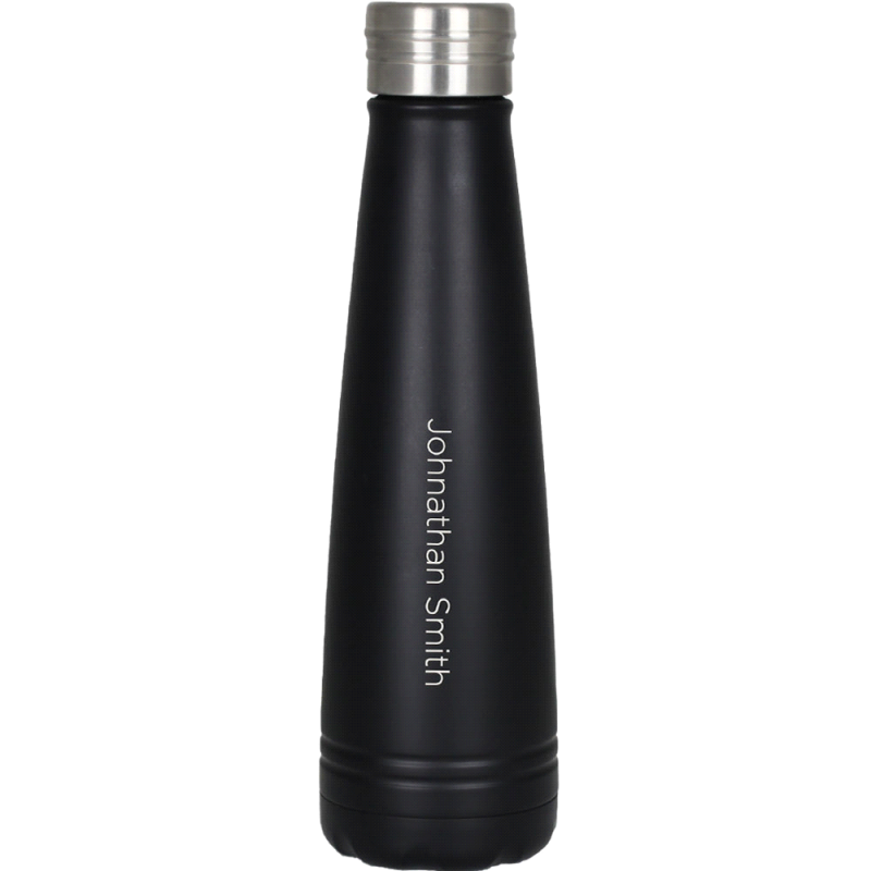Fashion-inspired stainless steel 750ml bottle with a gloss finish. It has a screw-on lid with a black ribbon handle. Tornado is BPA-free. The bottle laser engraves to a shiny stainless-steel finish. This product is not dishwasher safe, and handwashing is recommended.