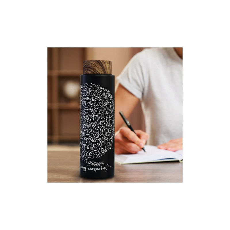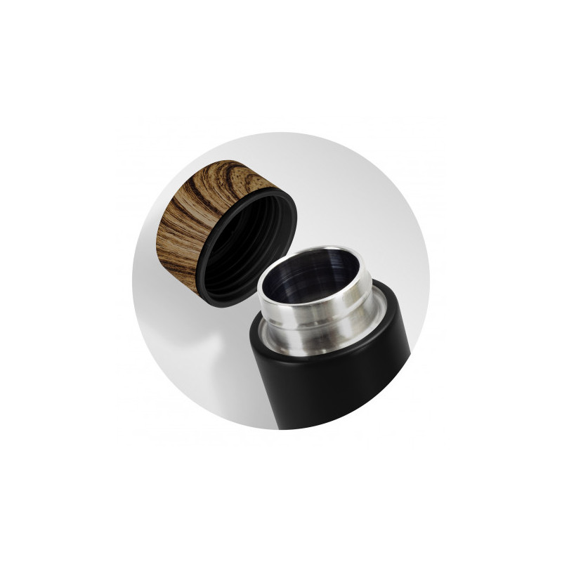 Robust 1L stainless steel, vacuum insulated drink bottle with a tough powder coated finish. The bottle features a stainless steel screw on lid with a convenient carry handle and the option of a bamboo panel. The bottle is presented in a black gift box.