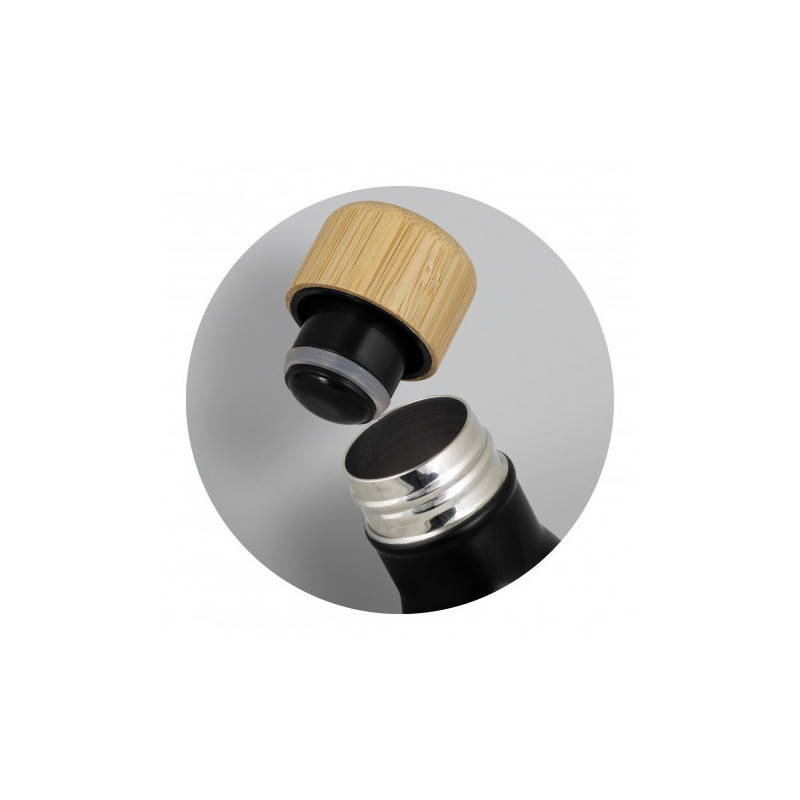 Robust 1L stainless steel, vacuum insulated drink bottle with a tough powder coated finish. The bottle features a stainless steel screw on lid with a convenient carry handle and the option of a bamboo panel. The bottle is presented in a black gift box.
