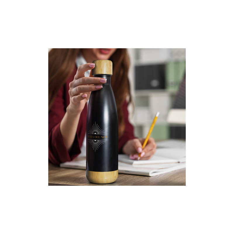 Elegant stainless steel vacuum bottle with a capacity of 480ml. Medina has a matte black body and a wood grained water transfer lid.
