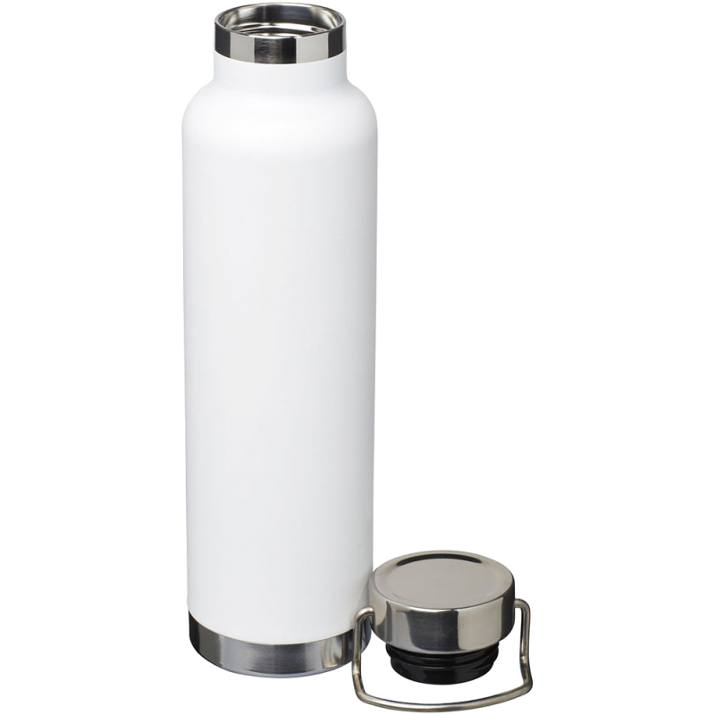 Deluxe 600ml stainless steel drink bottle that is vacuum insulated with a sleek design and a smart painted finish. It is BPA-free and features a secure stainless-steel screw-on lid which features a white polypropylene trim. It can be presented in a kraft gift box. The bottle is not dishwasher safe, and handwashing is recommended.