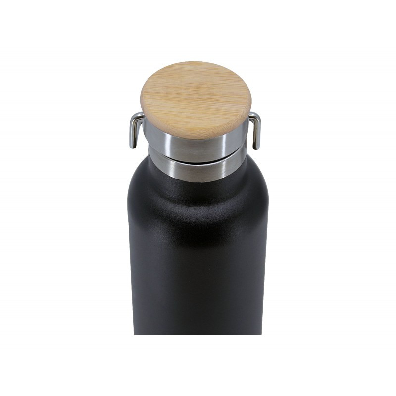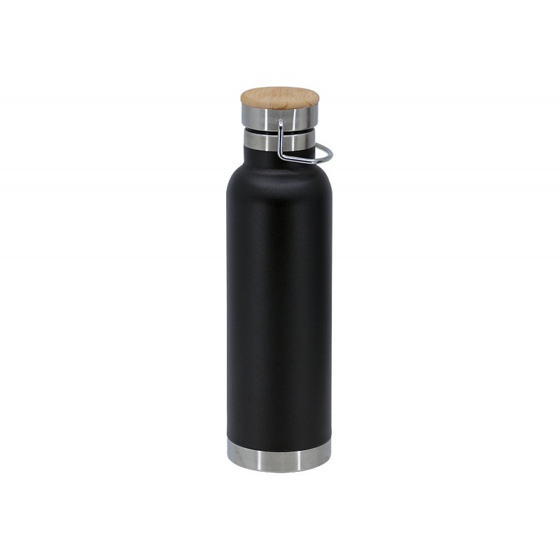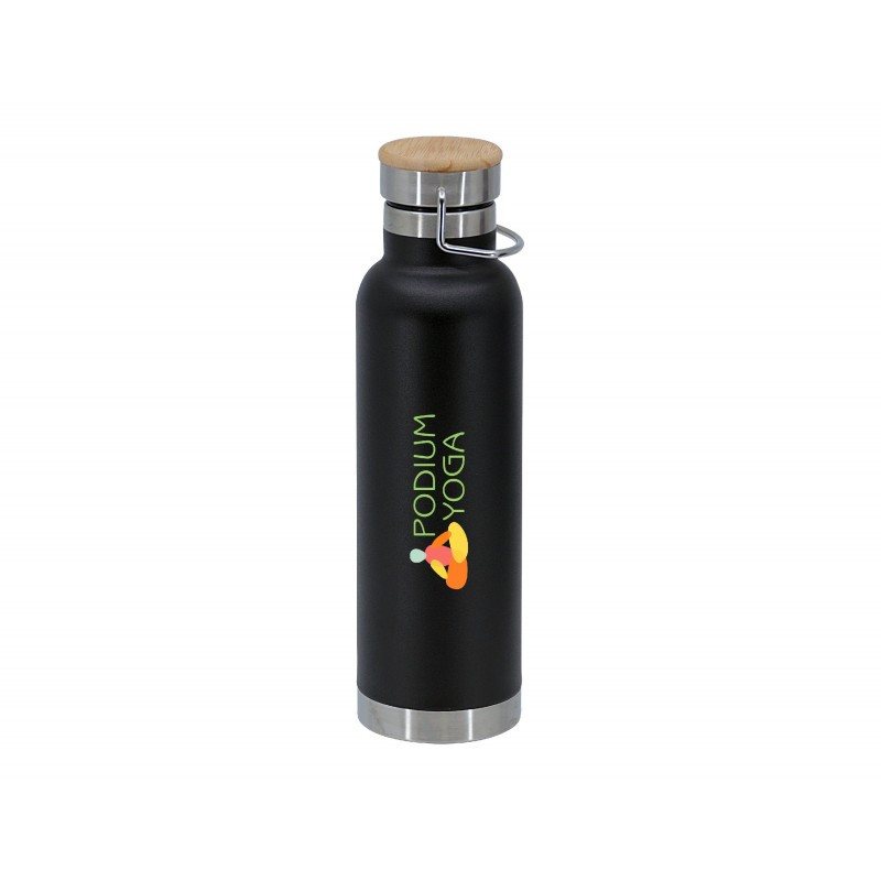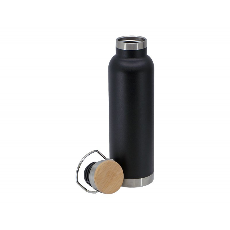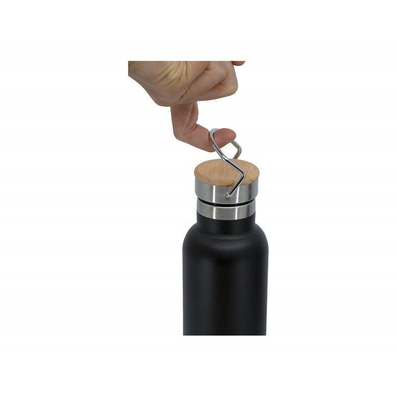 Robust 1L stainless steel, vacuum insulated drink bottle with a tough powder coated finish. The bottle features a stainless steel screw on lid with a convenient carry handle and the option of a bamboo panel. The bottle is presented in a black gift box.