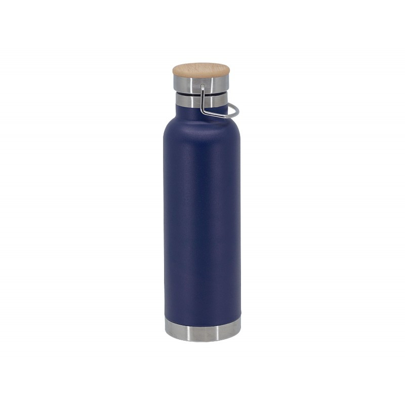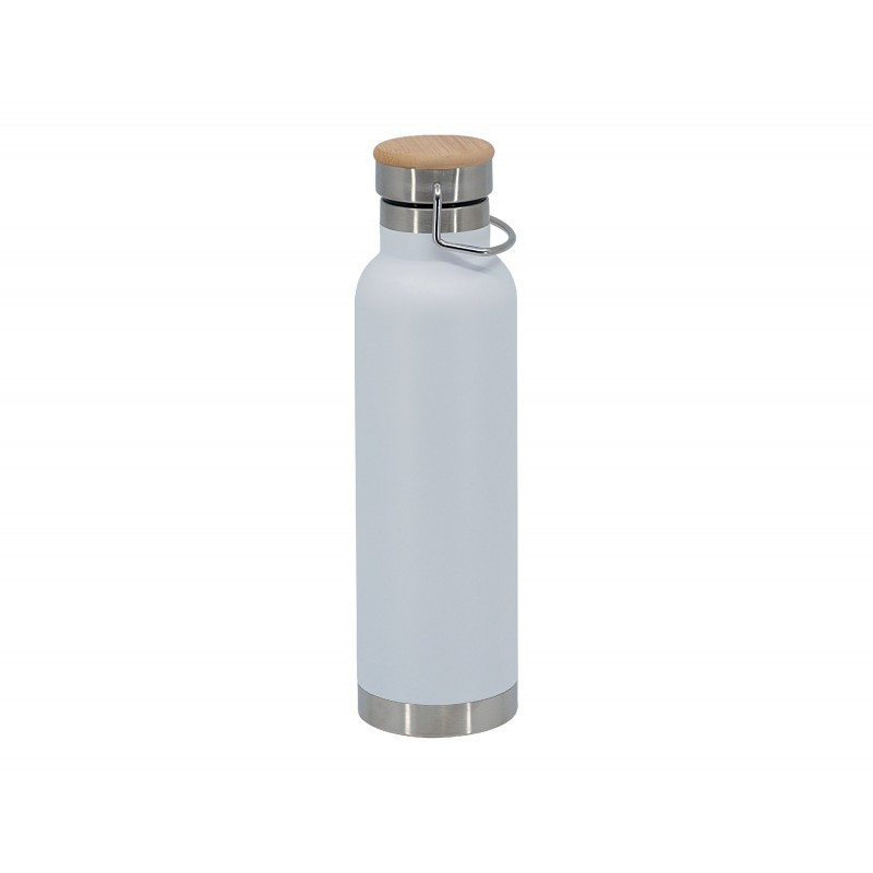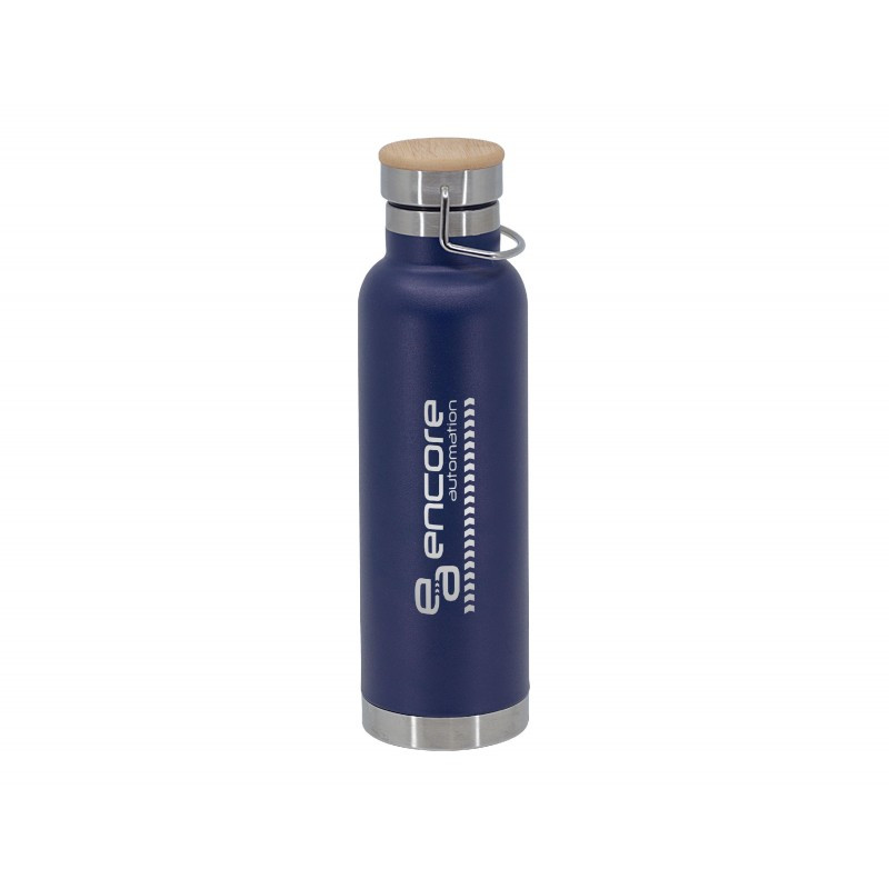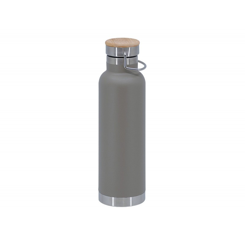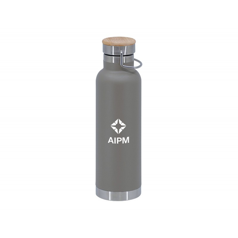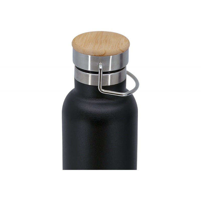 Robust 1L stainless steel, vacuum insulated drink bottle with a tough powder coated finish. The bottle features a stainless steel screw on lid with a convenient carry handle and the option of a bamboo panel. The bottle is presented in a black gift box.