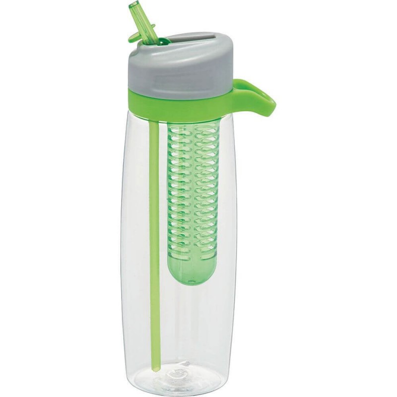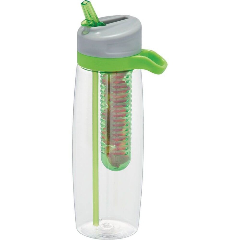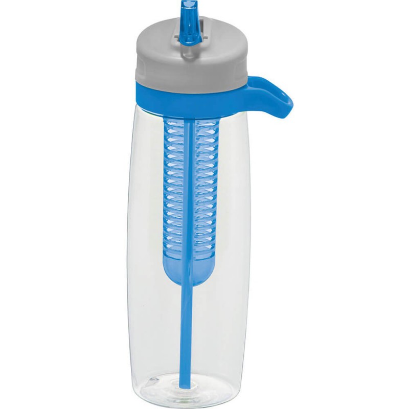 700ml transparent plastic drink bottle with fruit infuser, it is manufactured from Tritan material which is strong and tough, BPA free, has a secure screw on lid with carry handle and flip out drinking nozzle, it is not dishwasher safe and handwashing is recommended. Not intended for use with hot liquids or carbonated beverages, do not subject to high...