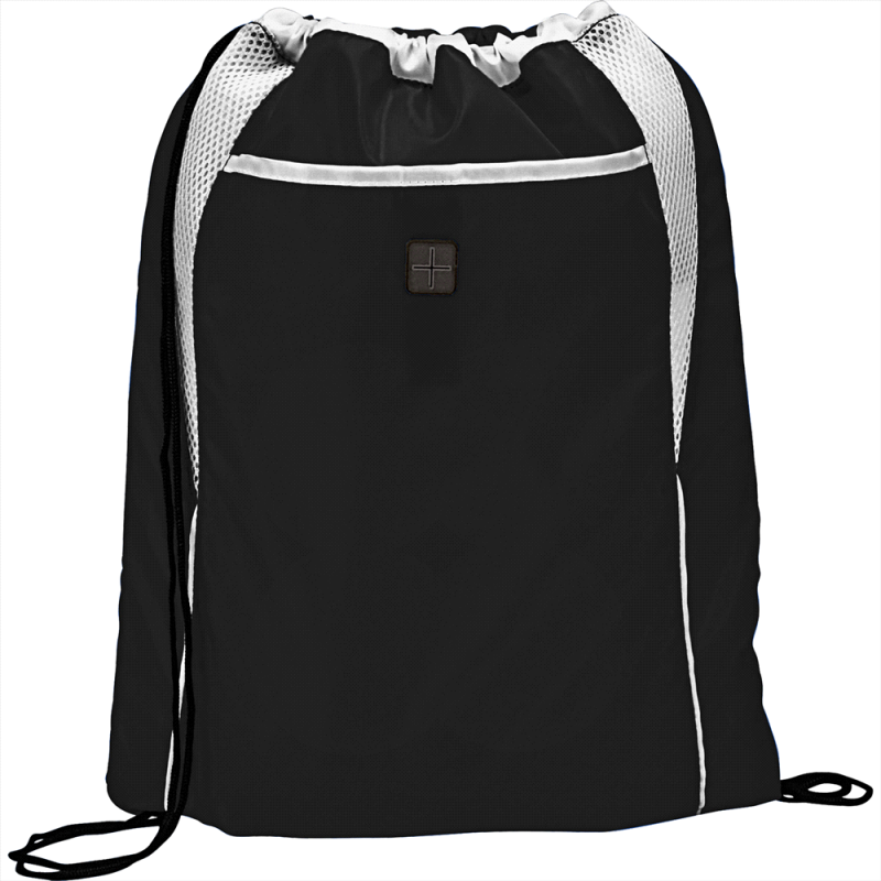 Open main compartment with drawstring closure. Zippered front slash pocket. Mesh accents on both sides.