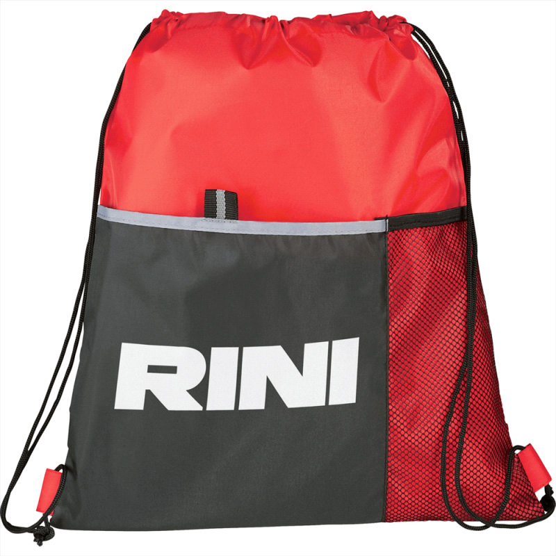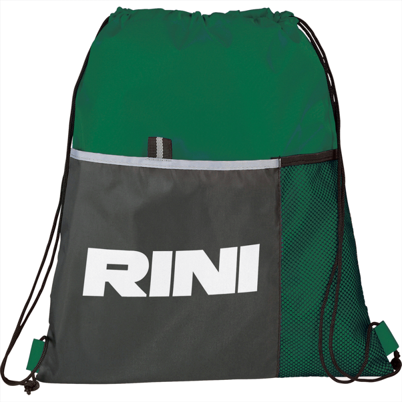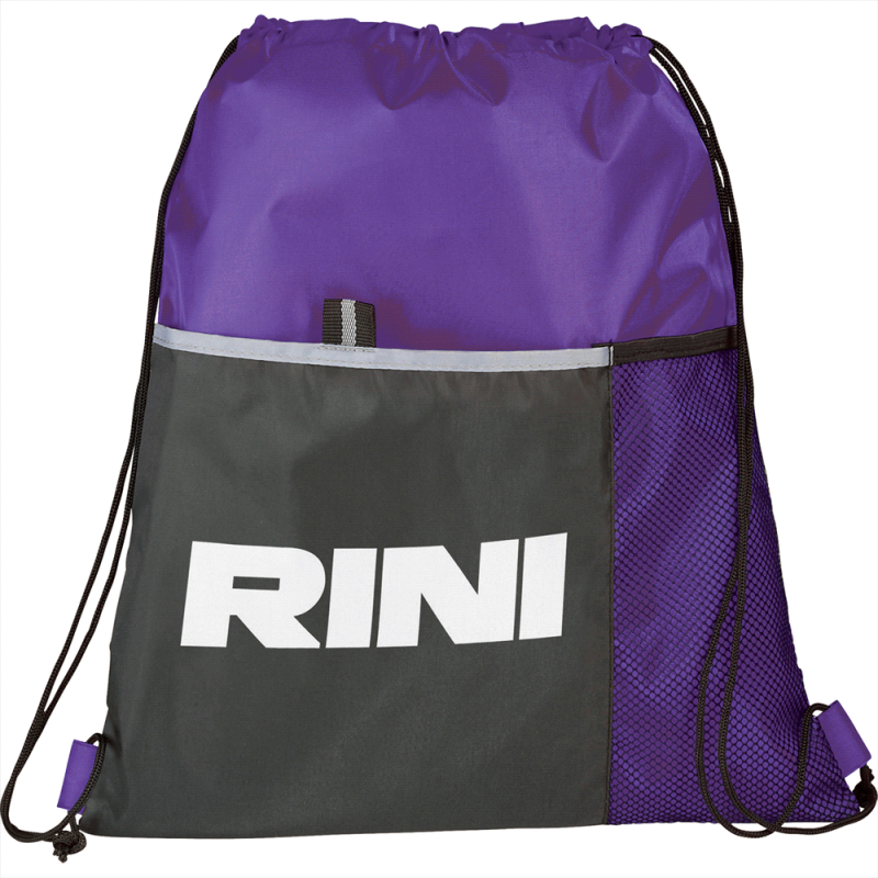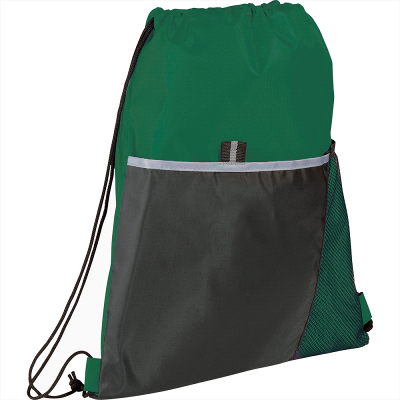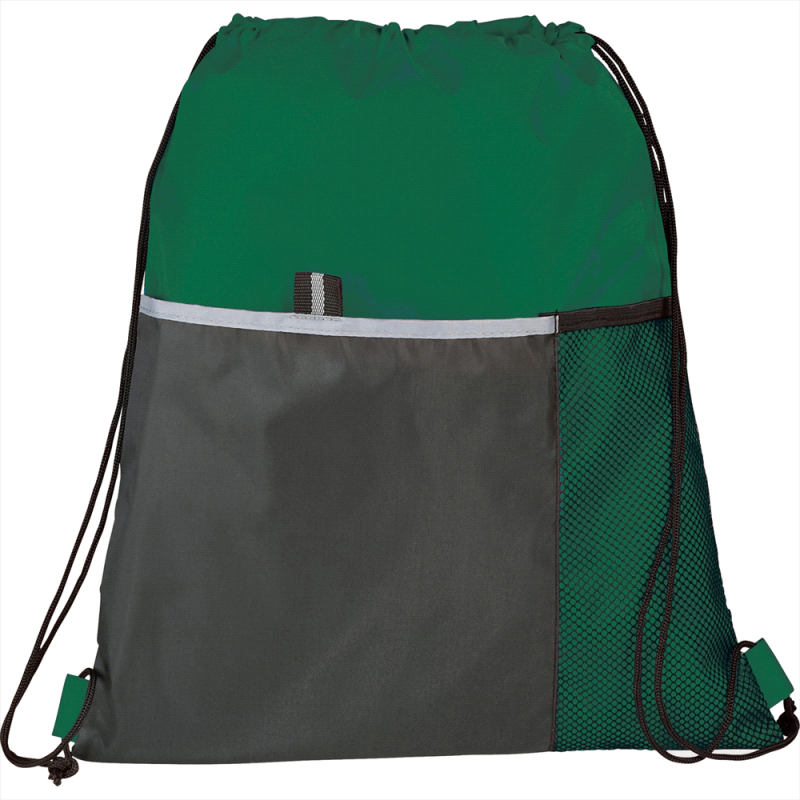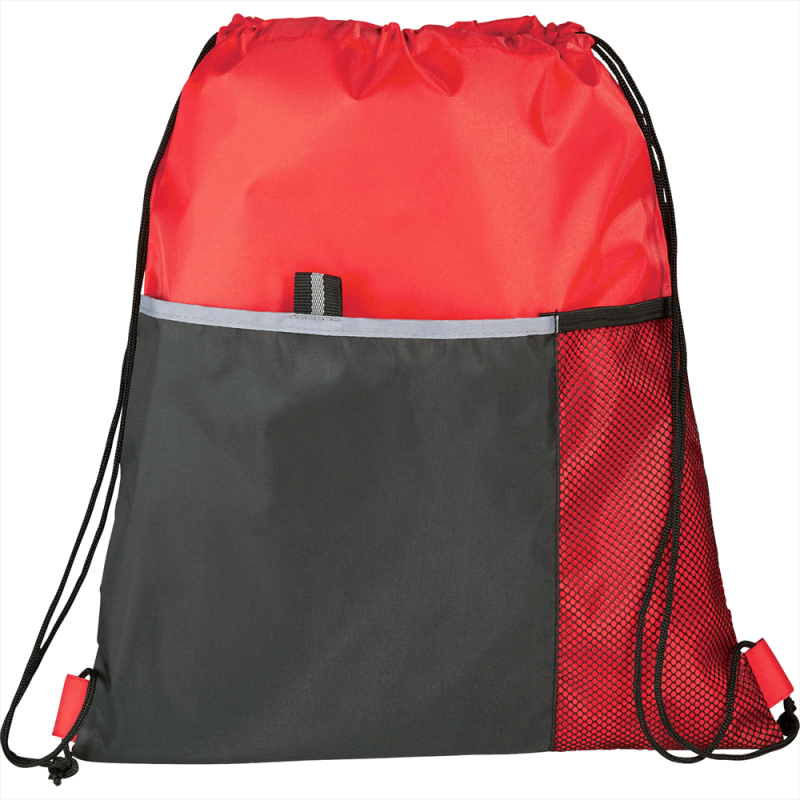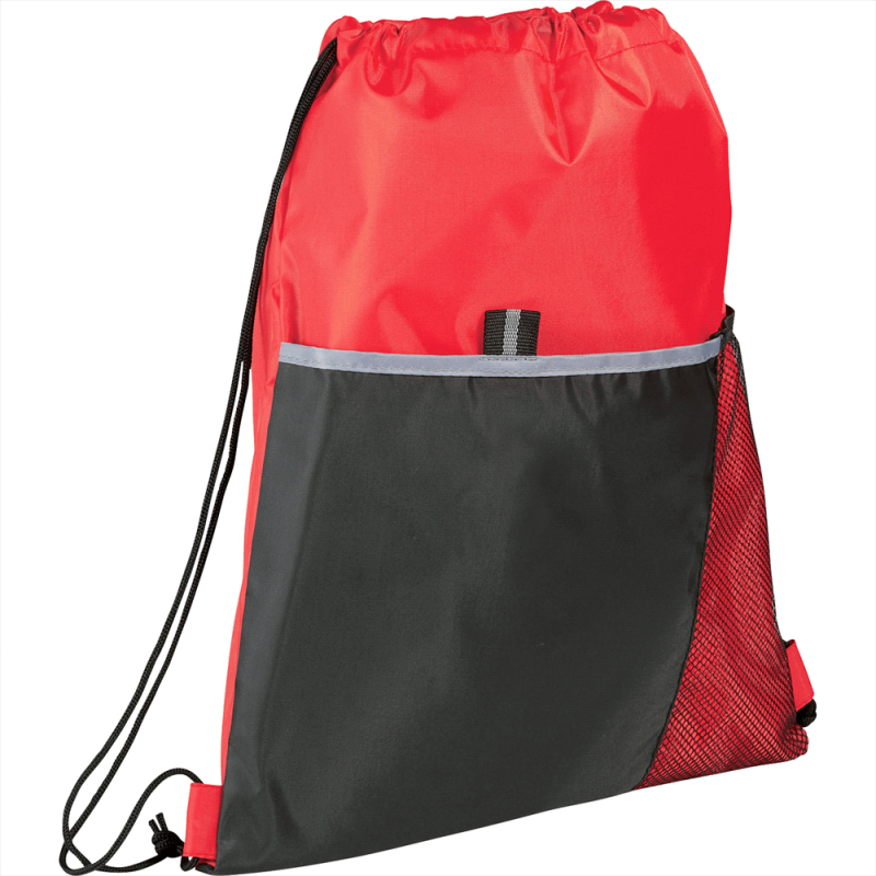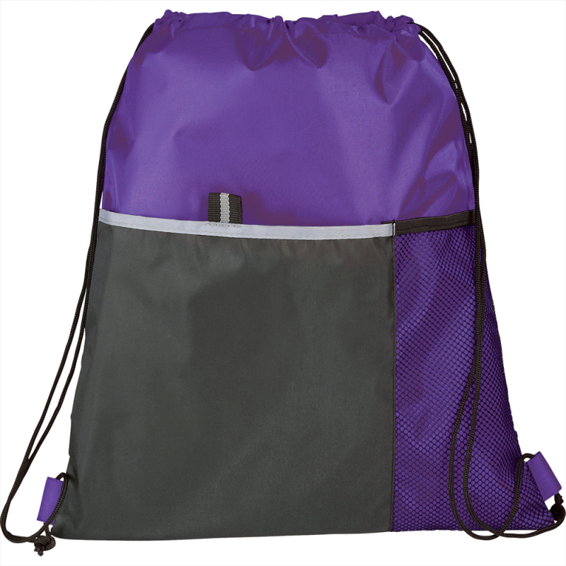 The Reclaim Recycled Drawstring Bag is made from RPET material. This drawstring features a zippered front pocket and cinch closure.