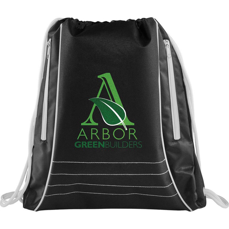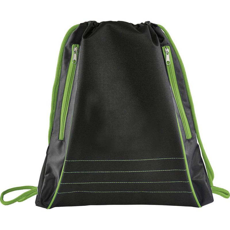 The Reclaim Recycled Drawstring Bag is made from RPET material. This drawstring features a zippered front pocket and cinch closure.
