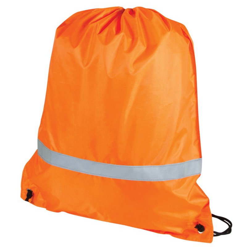 210D nylon rucksack with reflective strip. Large main compartment with drawstring closure and reinforced corners. Drawstring design for shoulder or backpack carry. Great as a vessel to hold emergency supplies