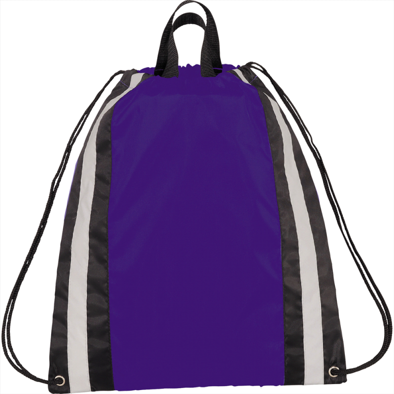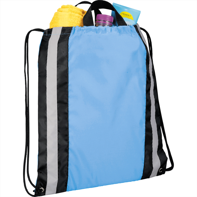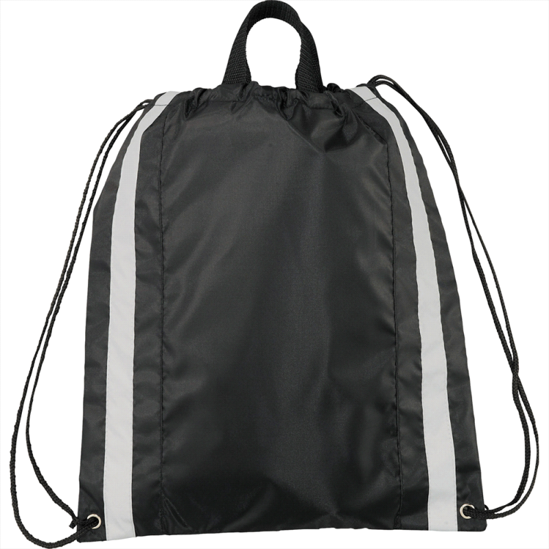Open main compartment with drawstring rope closure. Zippered front pocket with reflective stripe.